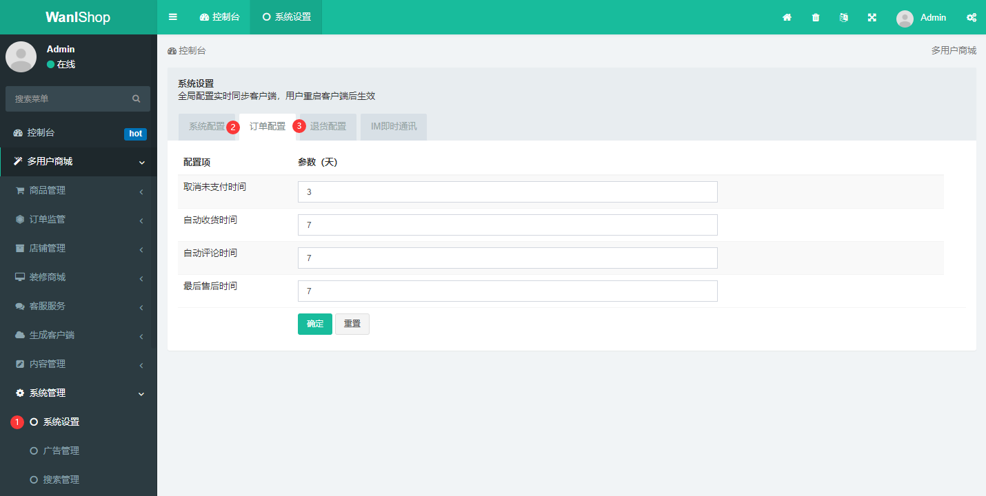 进入`后台 > 多用户商城 > 系统管理 > 系统设置`选择订单配置和退款配置,填写计划任务相应时长