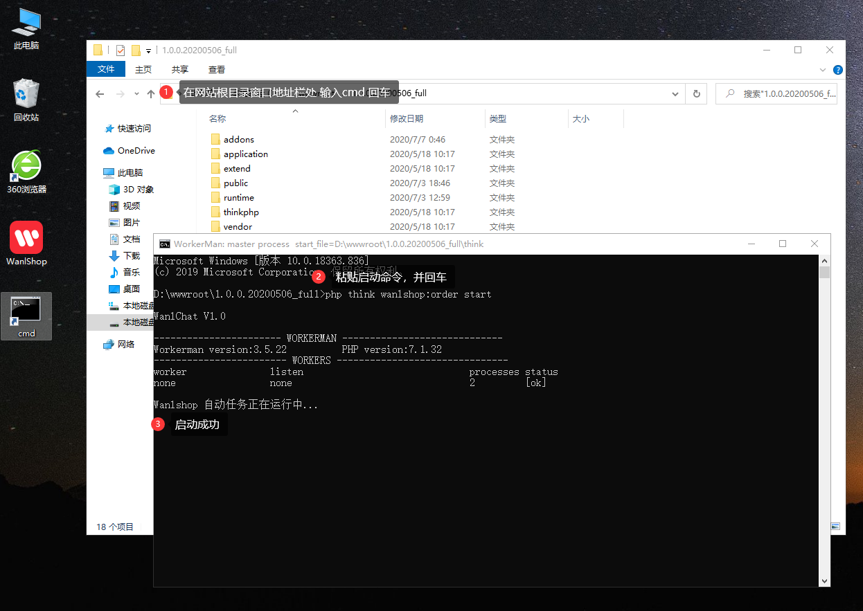 打开您网站根目录,在地址栏输入cmd回车,在打开的窗口输入`php think wanlshop:order start`开启服务