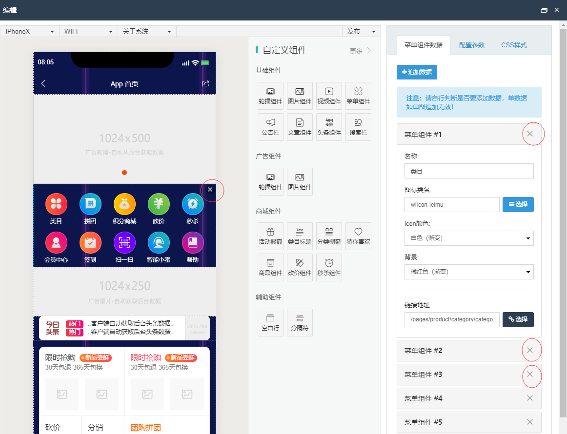 另外我们还可以看到,`预览窗口`当鼠标移动到指定组件上的时候 右上角会有一个 叉号,和`编辑窗口`每个数组框上也有叉号