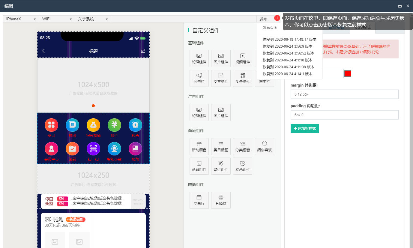 点击发布,系统会自动保存之前页面为历史记录,在点击 发布时候,会出现下拉菜单,在此菜单,你可以选择发布此版,和恢复历史版本,如果本版没有发布,就恢复历史版本,本版将不存在