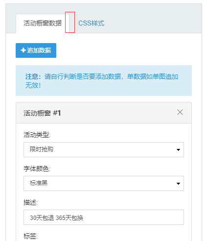 常用 选项卡`组件数据、配置参数、CSS样式`,其中`数据配置和CSS样式`每个模块几乎都存在,`配置参数`是根据组件具体配置要求是否要配置