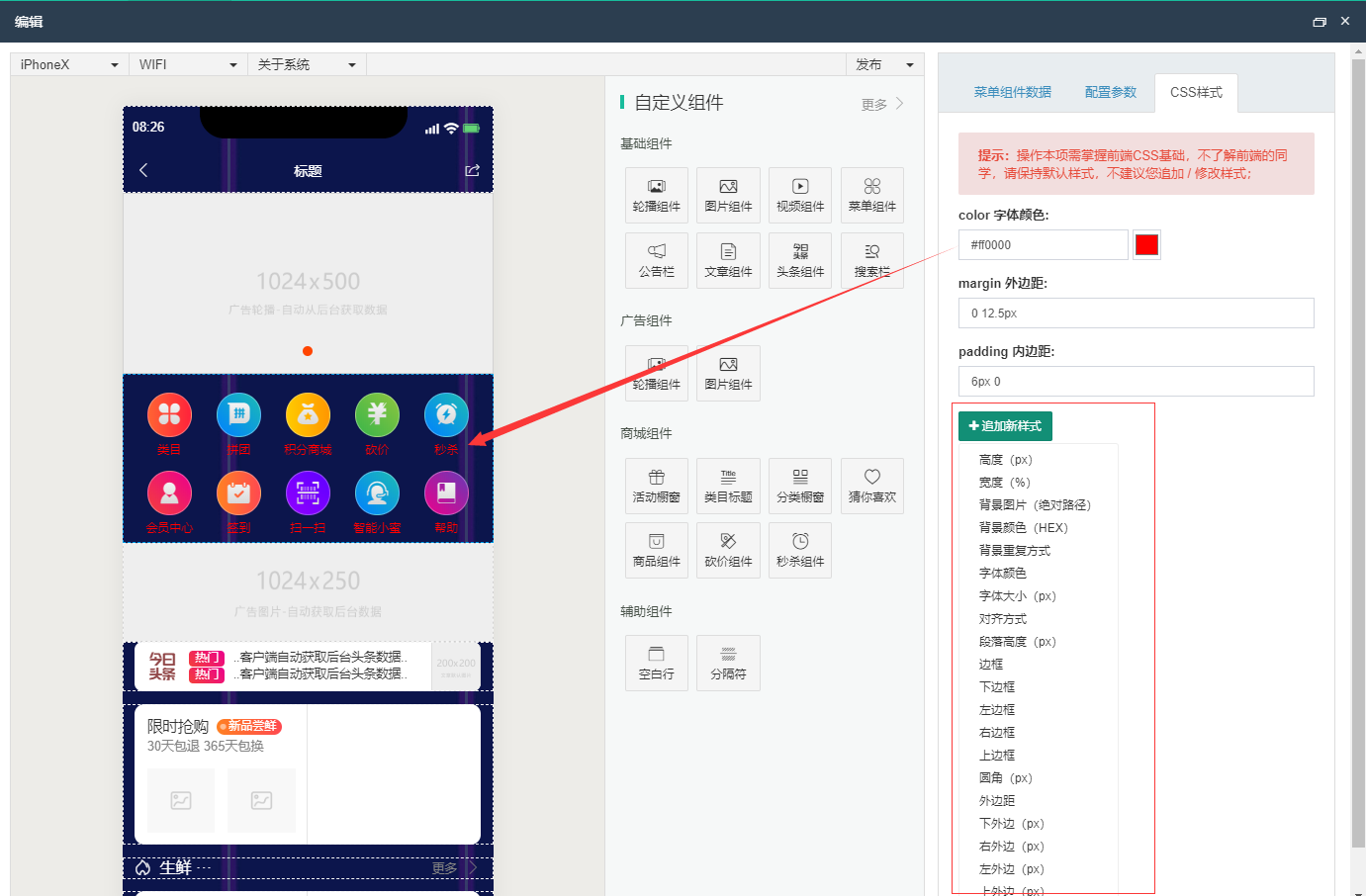 > 点击`自定义组件`,模块会自动添加进`预览窗口`,并且右侧`编辑窗口`会提供相应设置