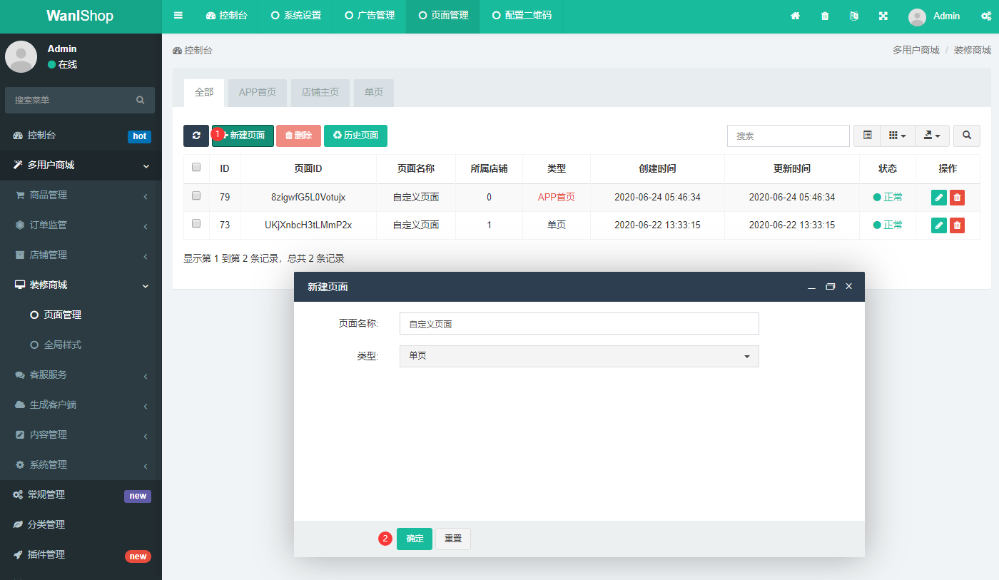 通过点击新建页面按钮可以创建 APP首页、店铺主页、专题页、创建首页仅可以在列表中或历史页面中不存在时创建,一般为误删后,安装系统自带默认页面,建议您在默认首页中修改