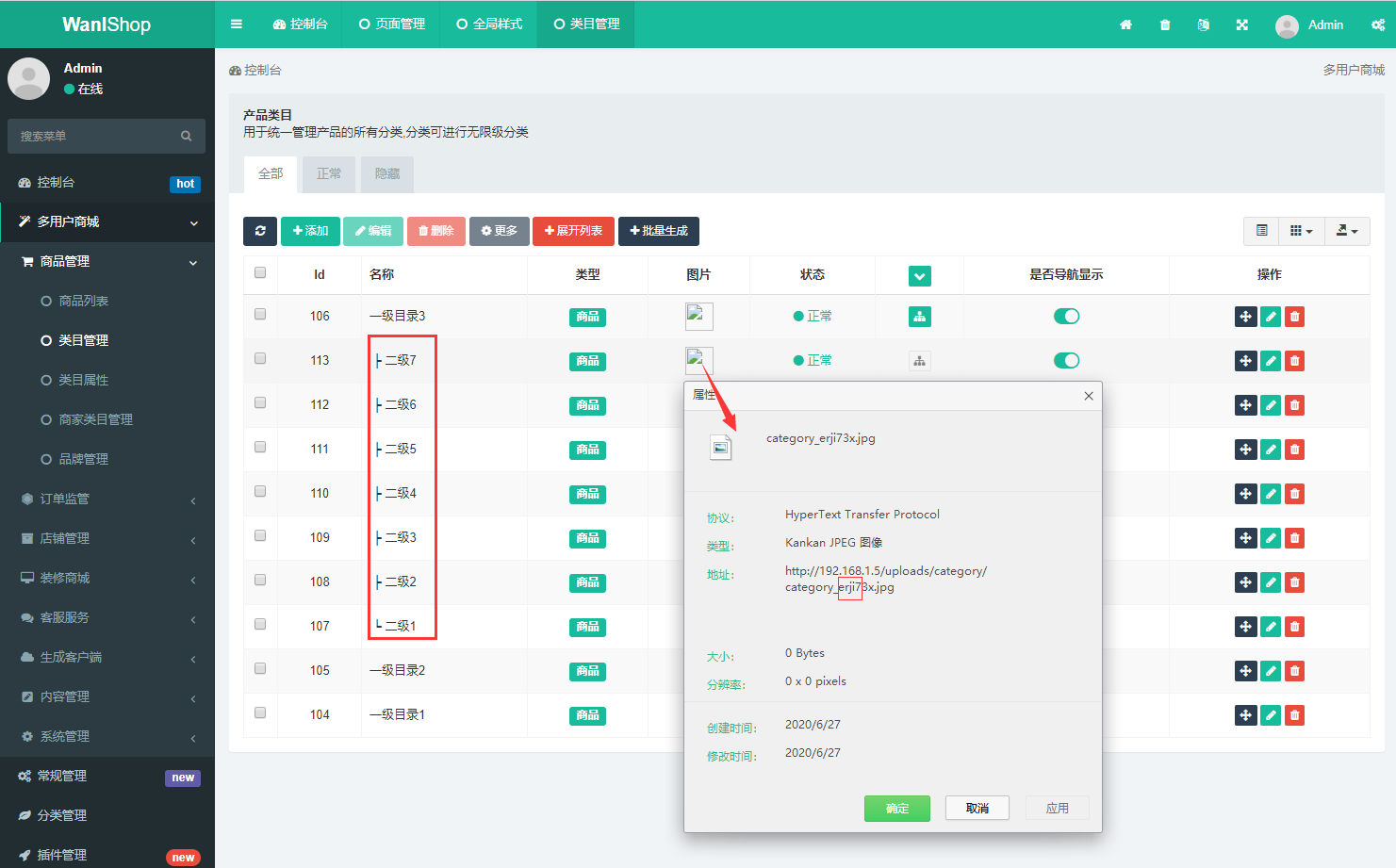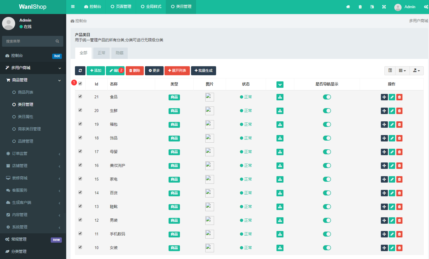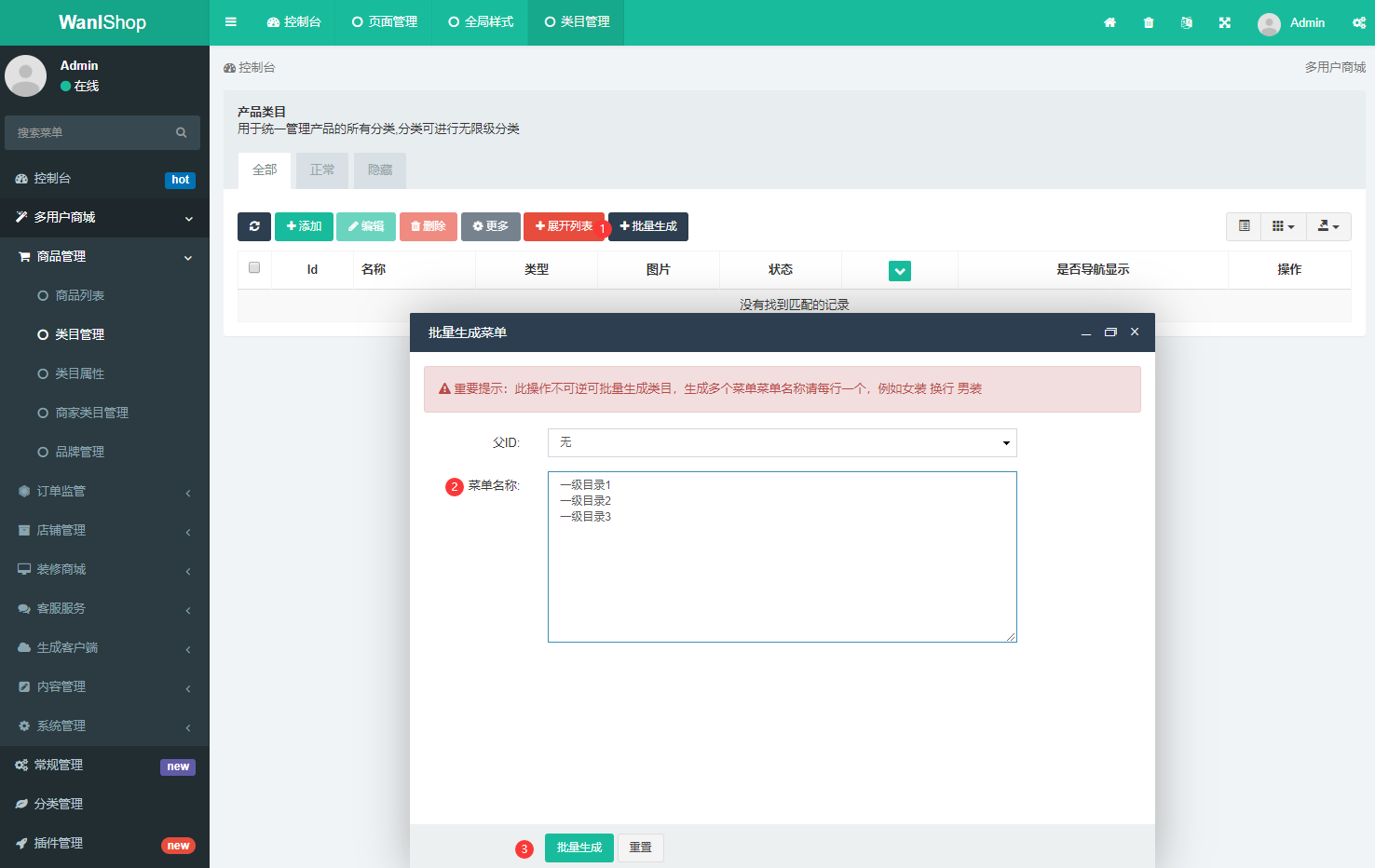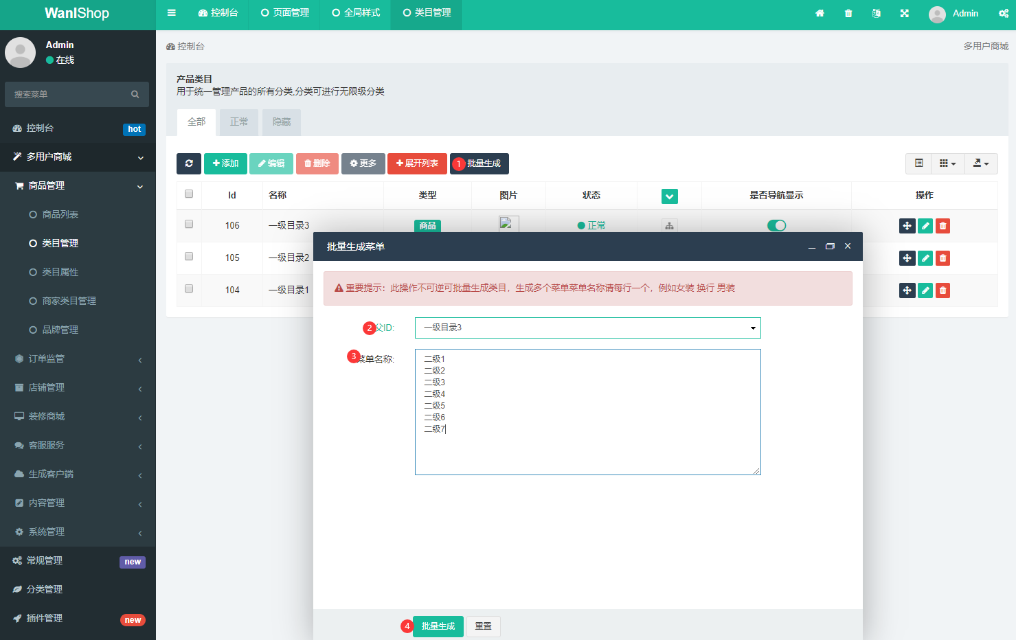 > 商城类目管理除自带增、删、改、查外,系统新增加 批量生成 N级类目,专门为商城类软件多类目特征设计