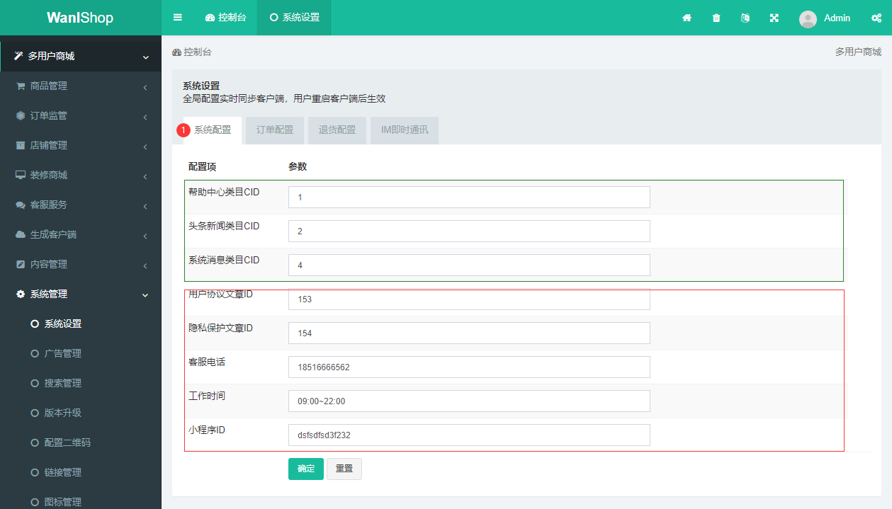 从后台进入`多用户商城 > 系统管理 > 系统设置`系统配置选项,本选项总共分2类,绿框标注告诉API加载的类目所属ID反馈给客户端,红框直接通过Api不做任何处理反馈给客户端