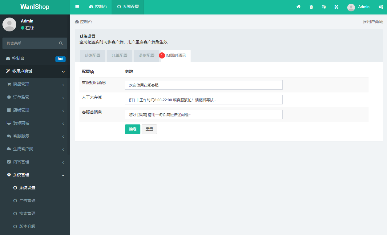 主要用作智能客服自动回复的相关配置,修改后实时同步到客户端