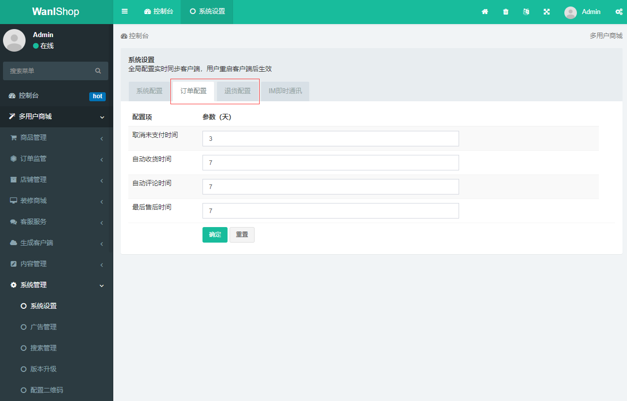 > 系统设置主要作为 后台、商户中心、API 提供统一配置参数,实时同步修改插件列表wanlshop插件配置