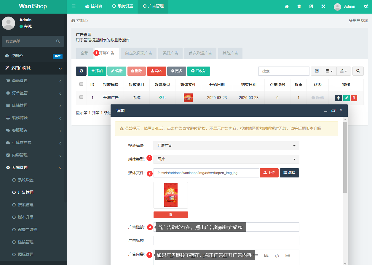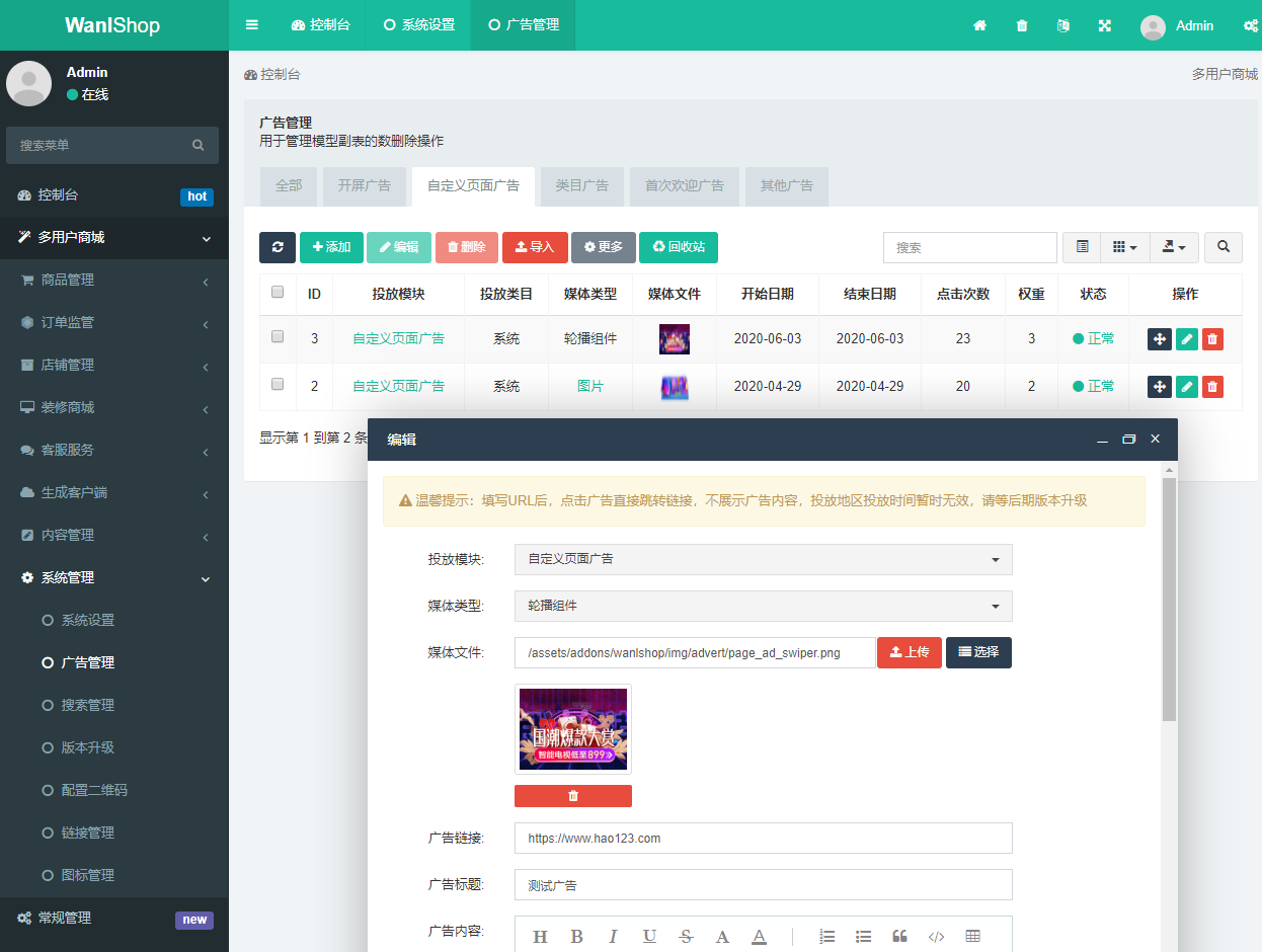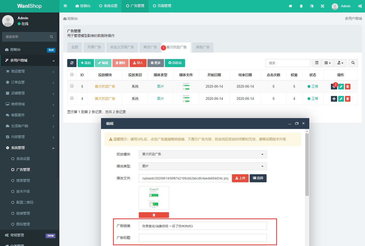 > 广告管理,主要用于管理客户端广告和创建广告内容,在创建广告的时候请自定判断表单具体如何填写