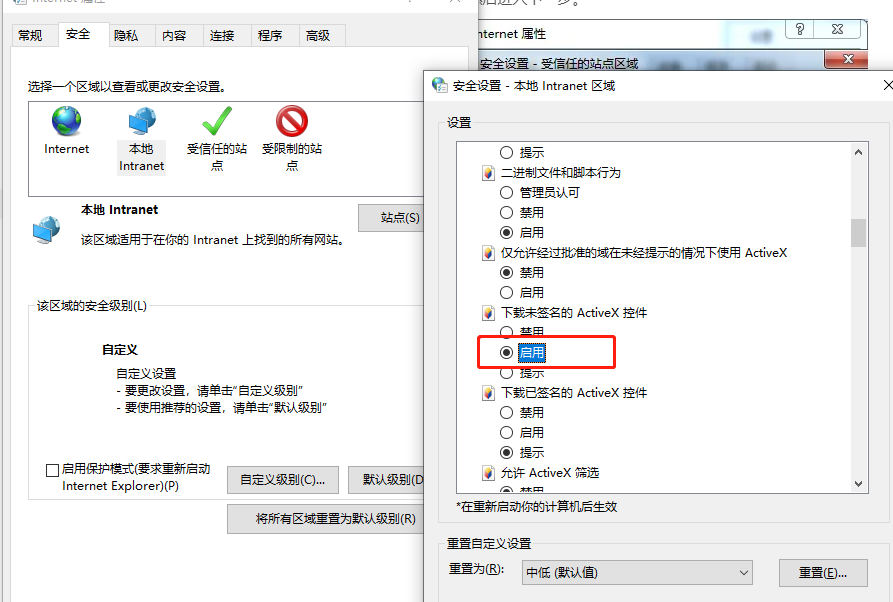 4\*然后,在弹出窗口中,滑动鼠标找到【下载未签名的ActiveX控件】,选择“启用”,再单击下面的“确定”按钮,如下图所示,然后进入下一步