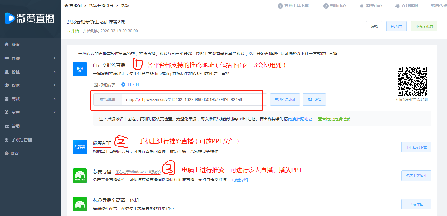 > **微赞app推流**:随时随地直播,也可以播放PPT,需要手机电量充足、三脚架稳定。这是一种比较简单、便捷直播需求。常见抖音等、小视频直播这种。