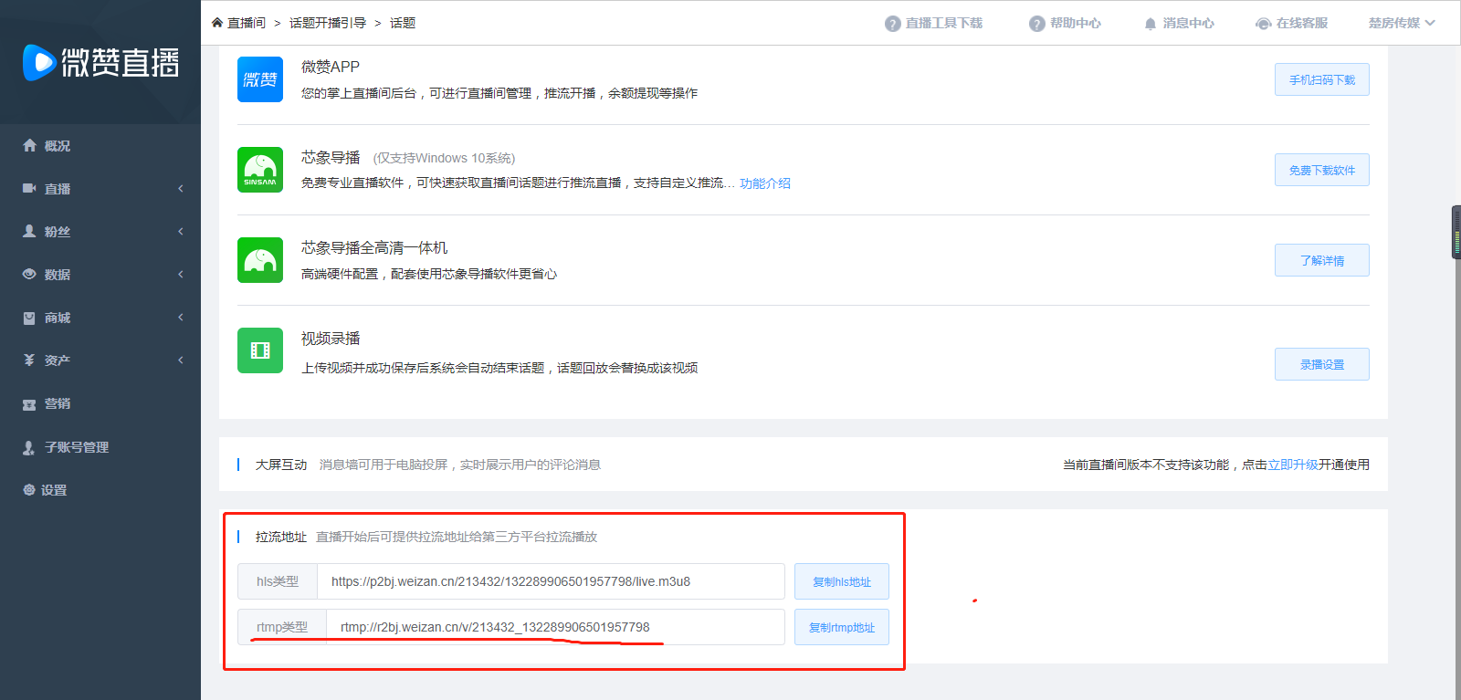 进入后我们会看到这个新建的直播间的**推流地址**(其他软件推流使用的地址)