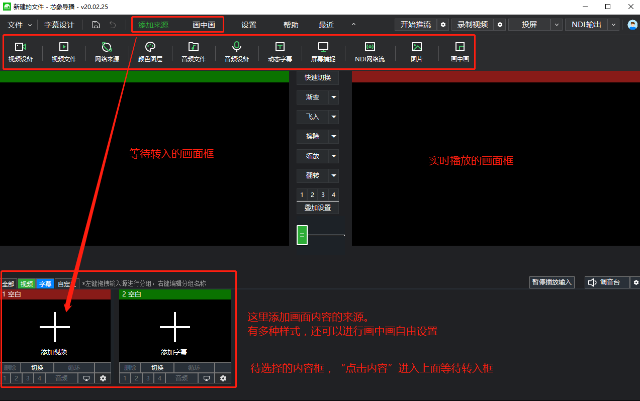 > PS:常见操作流程:先载入一个主题画面,需要播放的内容点击放到等得切入区,然后切入画面实时播放,切换其他画面时,先从下内容里点击放到等待区,再切换。