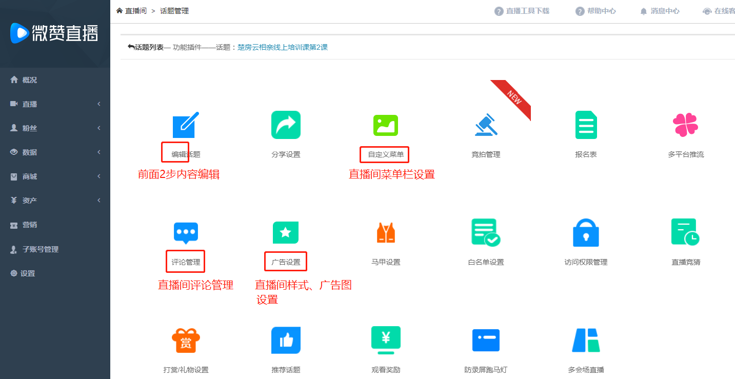 4.直播间的管理设置,可设置自定义菜单栏、回复管理等、