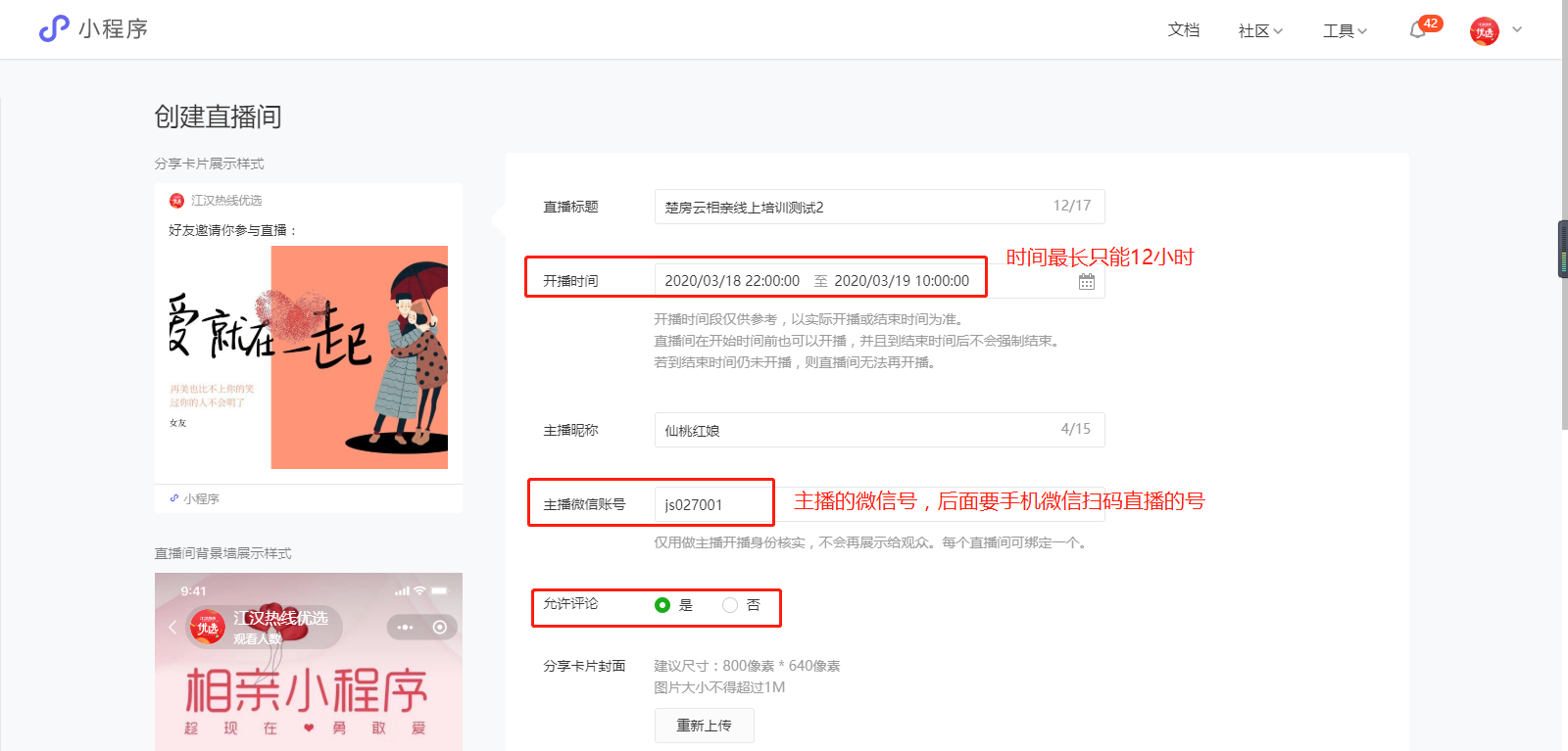 主要设置开播时间、主播的微信号、封面图等。