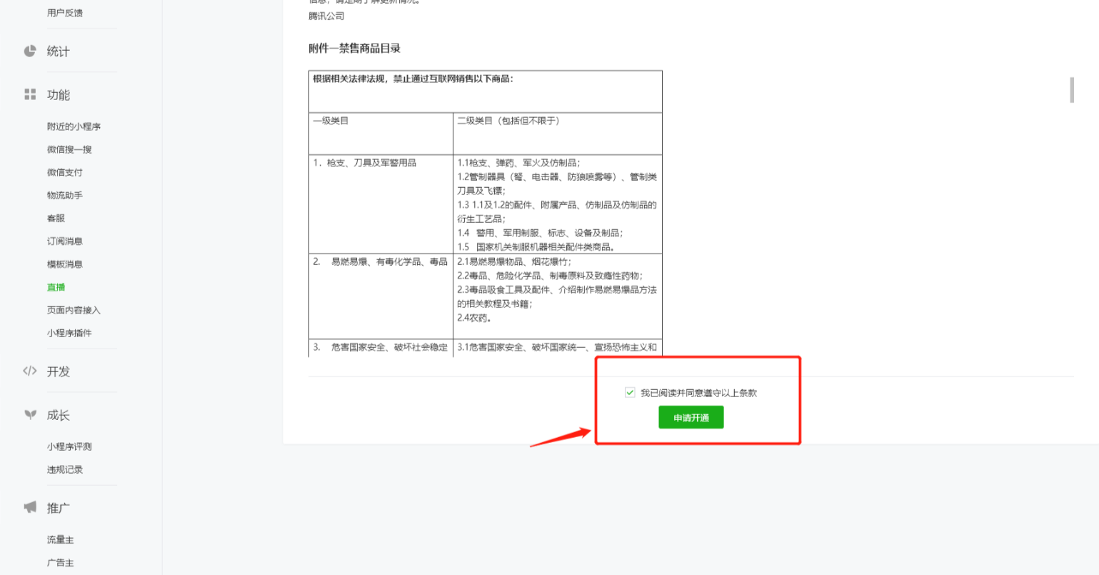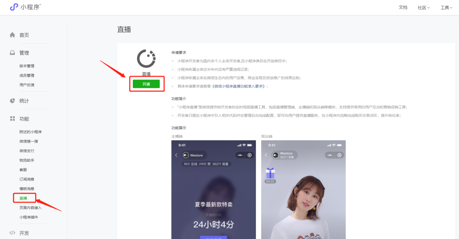 **一、申请小程序直播功能**