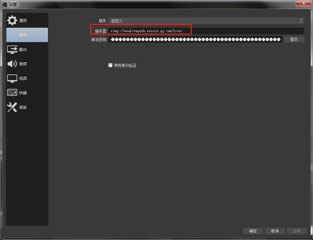注意:这个地址在OBS推流软件里是分成两部分的,第一部分是服务器地址是下图红框里的地址,到单词“live”那里带斜杠;后面的是第二部分是推流的串流秘钥