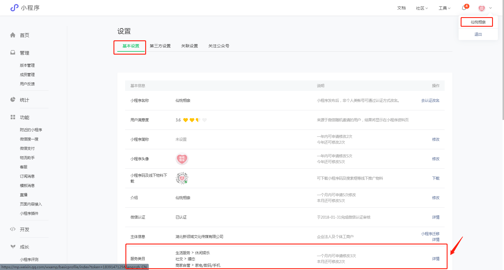 登录相亲小程序,点击右上角进入账号基本设置,选择服务类目,点击详情。