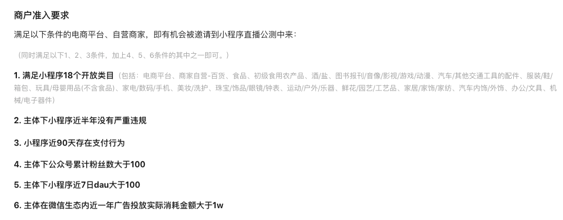 小程序开通直播功能,需要添加 **“电商平台、商家自营”**的服务类目后,满足条件即可申请开通小程序直播功能。上述两大类目添加后,符合标准直接可见申请入口。