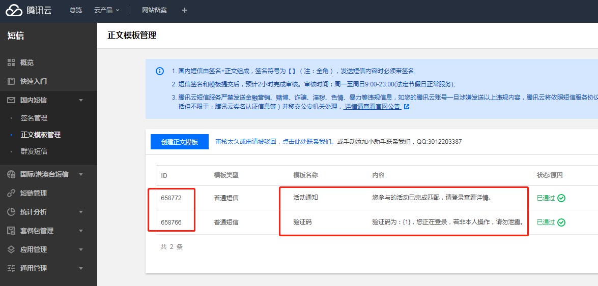 > 申请腾讯云接口,可以使用短信模板和实名认证,可增加营销短信模板使用和实名认证的通过率。