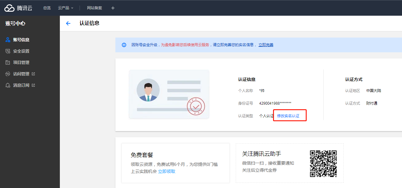 > 首先,需要注册腾讯云账号,并进行企业认证。才能申请人脸认证接口