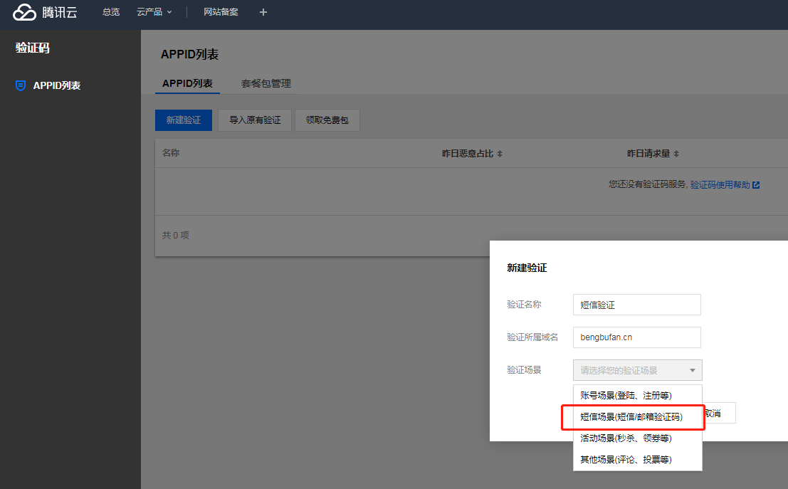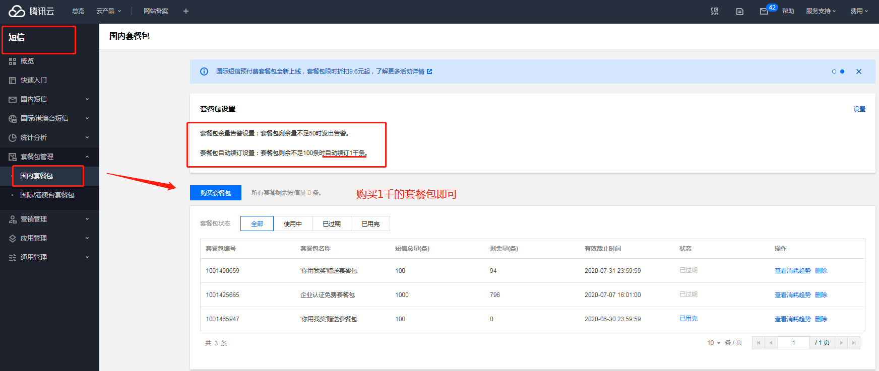 腾讯云短信接口,需要购买套餐包,需要注意套餐包余量、余额充值。最好设置自动续订1千条短信包。续费费用1千条=40元。