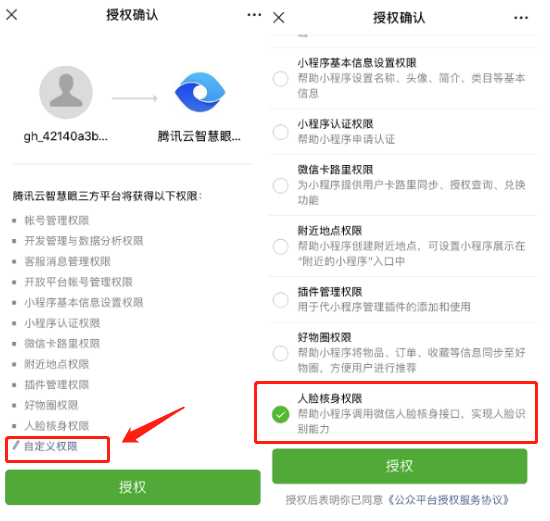 选择“自定义权限”、勾选“人脸核身”权限即可