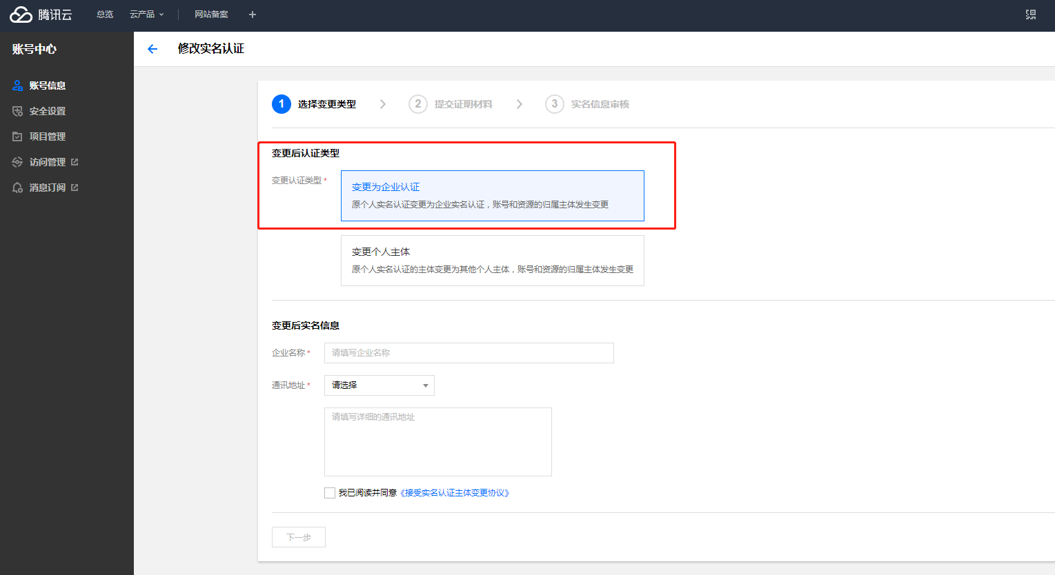 账号信息内,点击认证状态,需要升级修改为企业认证。