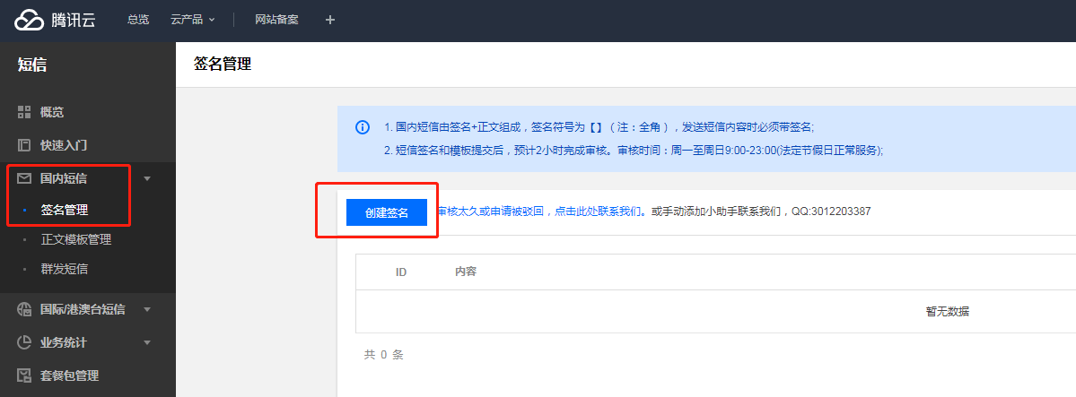 2、申请开通接入,然后进入“国内短信”创建短信签名