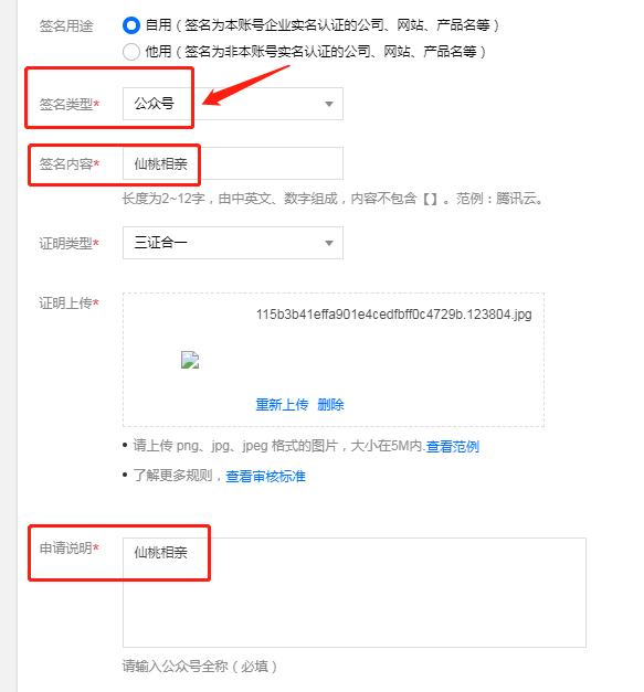 公众号同名,签名类别选择“公众号”,上传营业执照、申请说明填写公众号全称。