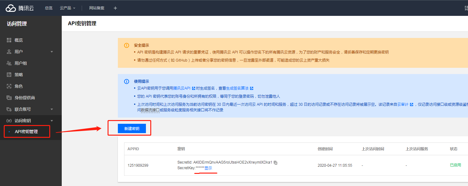 企业账号认证通过了,获取腾讯云的接口参数(SecretId、SecretKey)