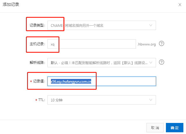 **主机记录**:二级域名名称。(如 xq.jhrx.cn 就填:xq)