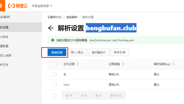 3、登录域名管理平台添加解析。(示例:阿里云域名管理)