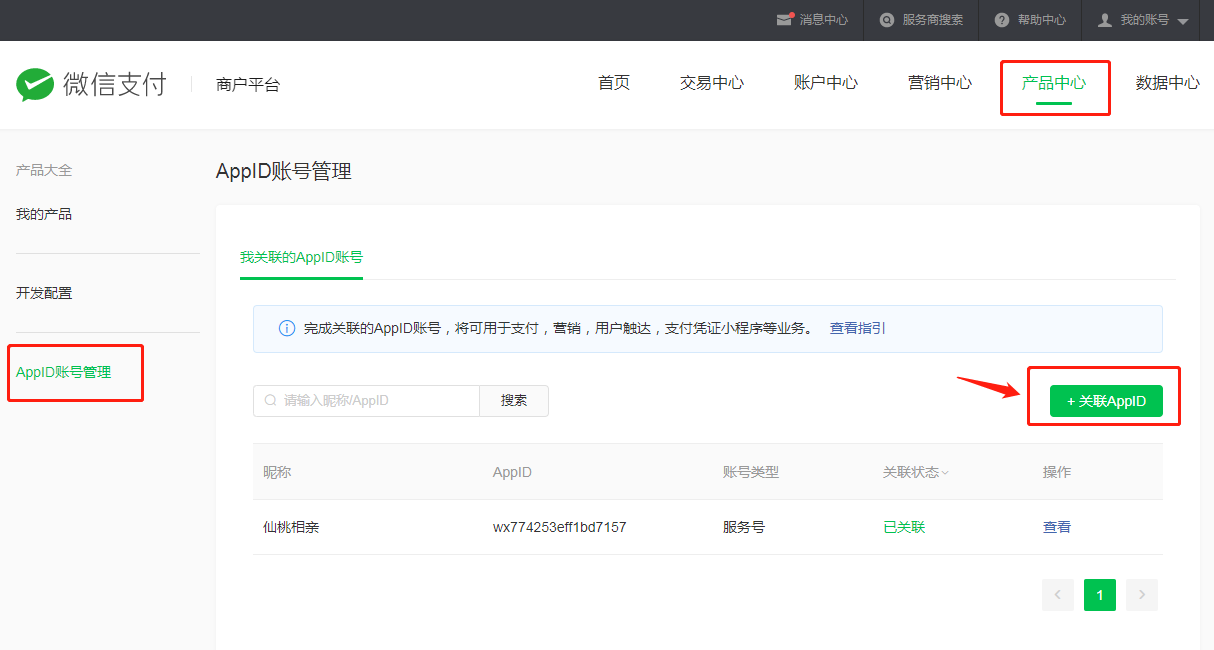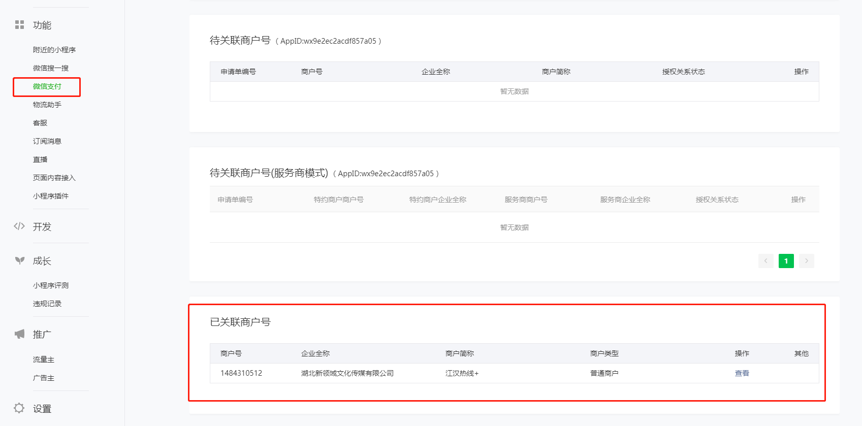 进入后台点击 微信支付>待关联商户号 ,查看详情—确定授权申请。