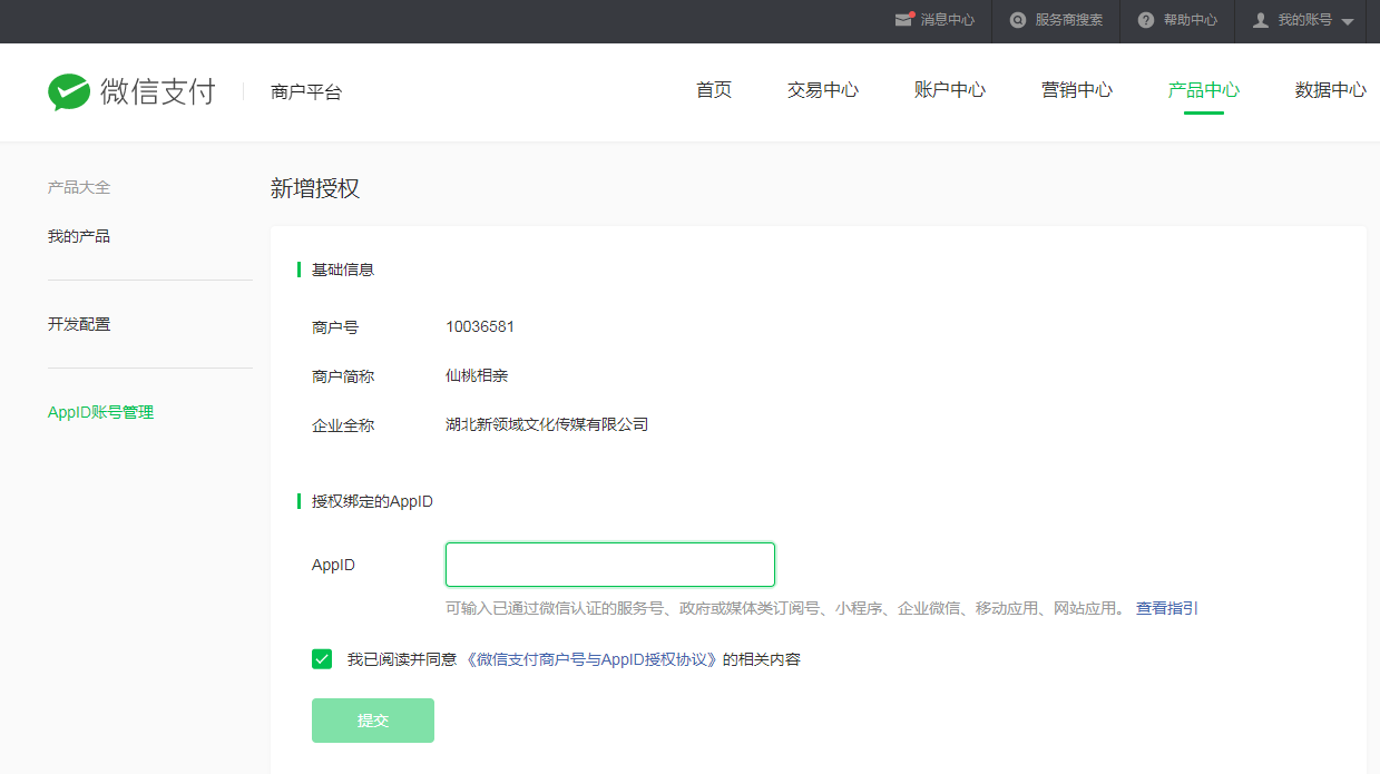 填写需要开通支付的小程序APPID信息,阅读并同意协议,发起授权申请;