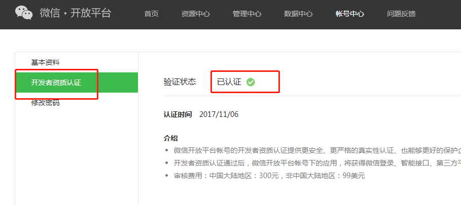 账号中心—开发者资质——完成微信认证。(已认证的略过)