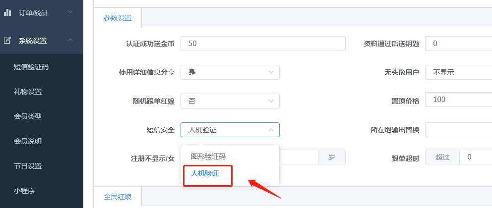 技术设置接口后,可以在相亲管理后台选择“滑动图形验证”,切换图形验证和人机验证。
