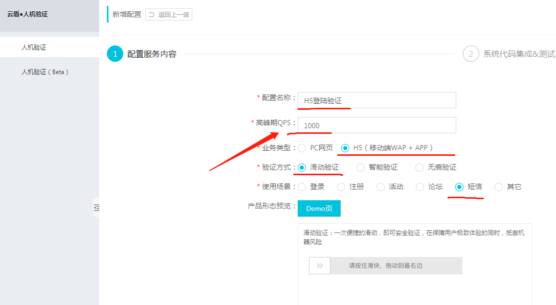 新增配置,设置**峰值1000** 选择 **滑动验证、短信场景**。