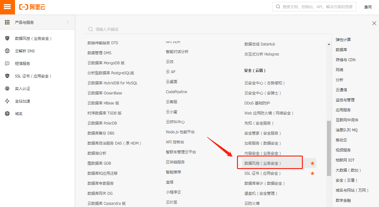 首先,登陆阿里云-控制台,搜索 “**数据风险(业务安全)**”,设置人机验证。