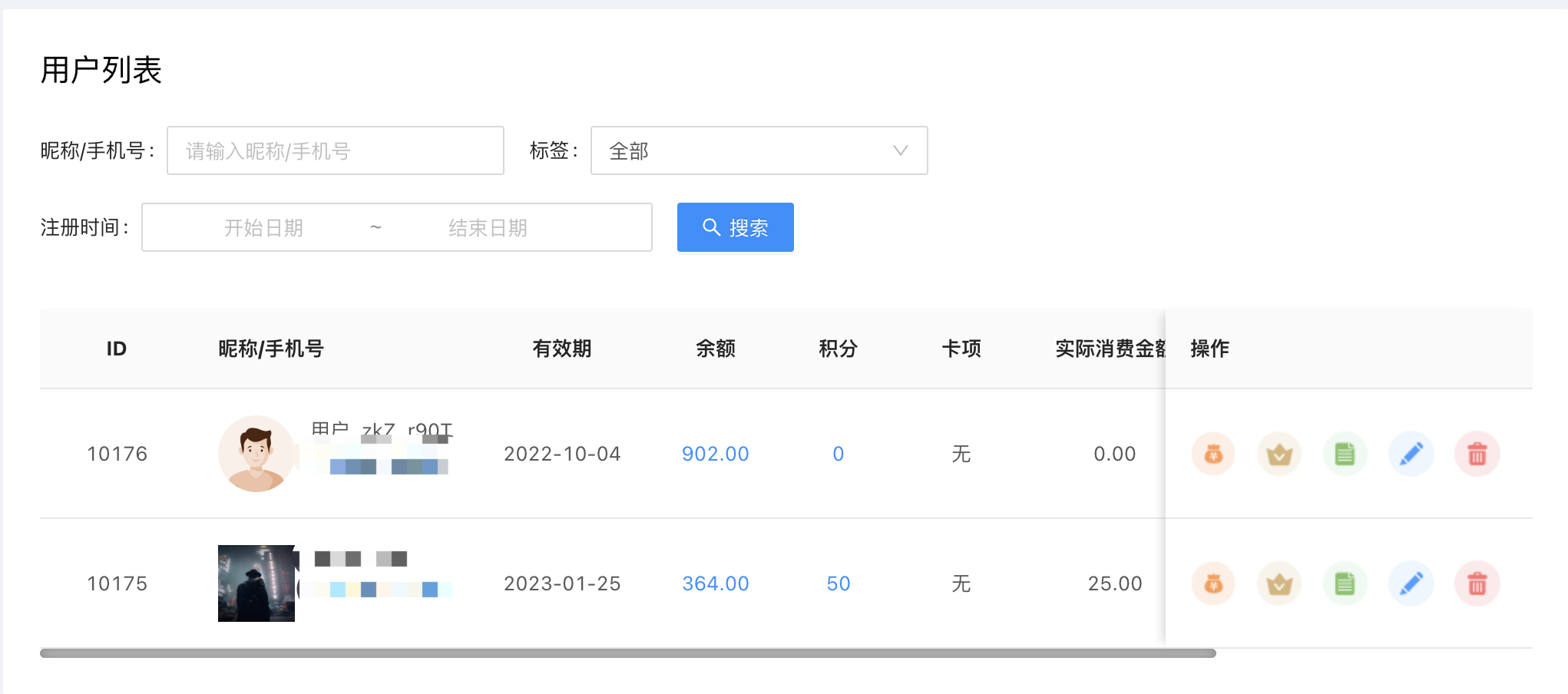 此页面可以管理平台所有用户,包含会员信息编辑、赠送会员、充值等操作