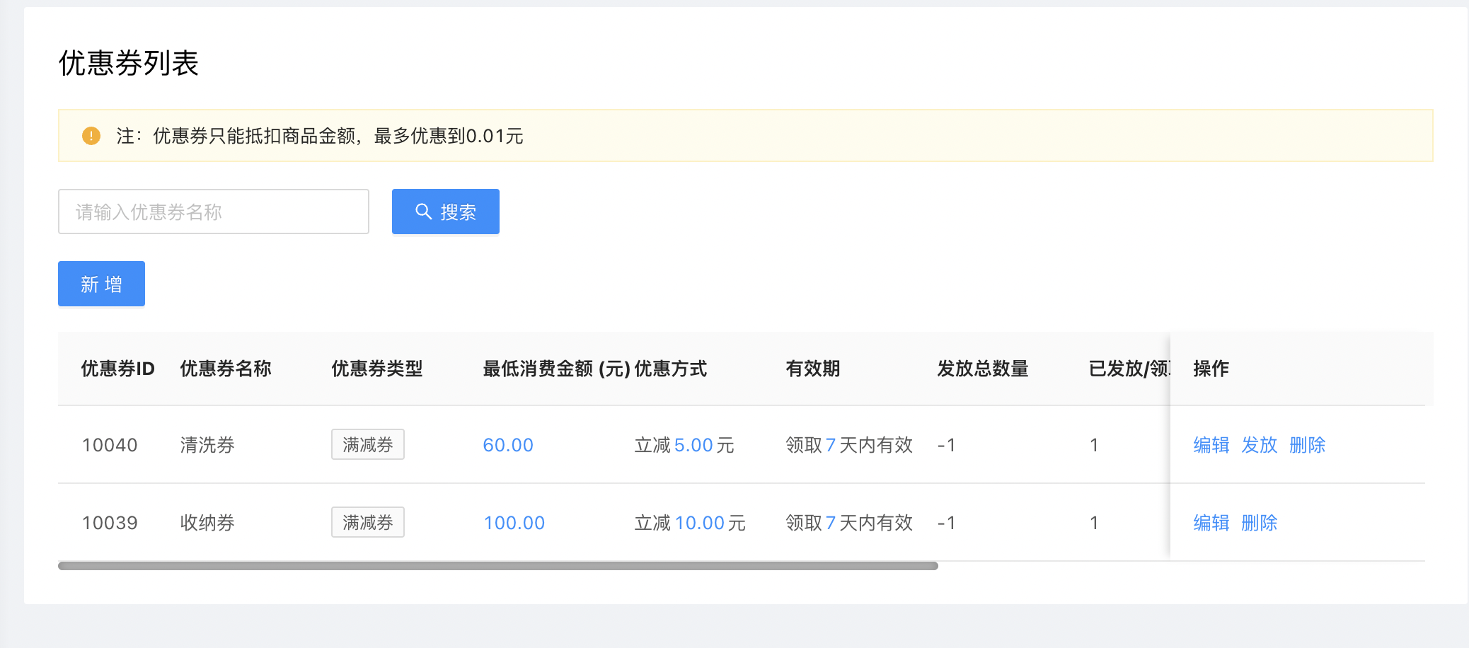 位置:营销管理 -> 营销中心 -> 优惠券 -> 优惠券列表