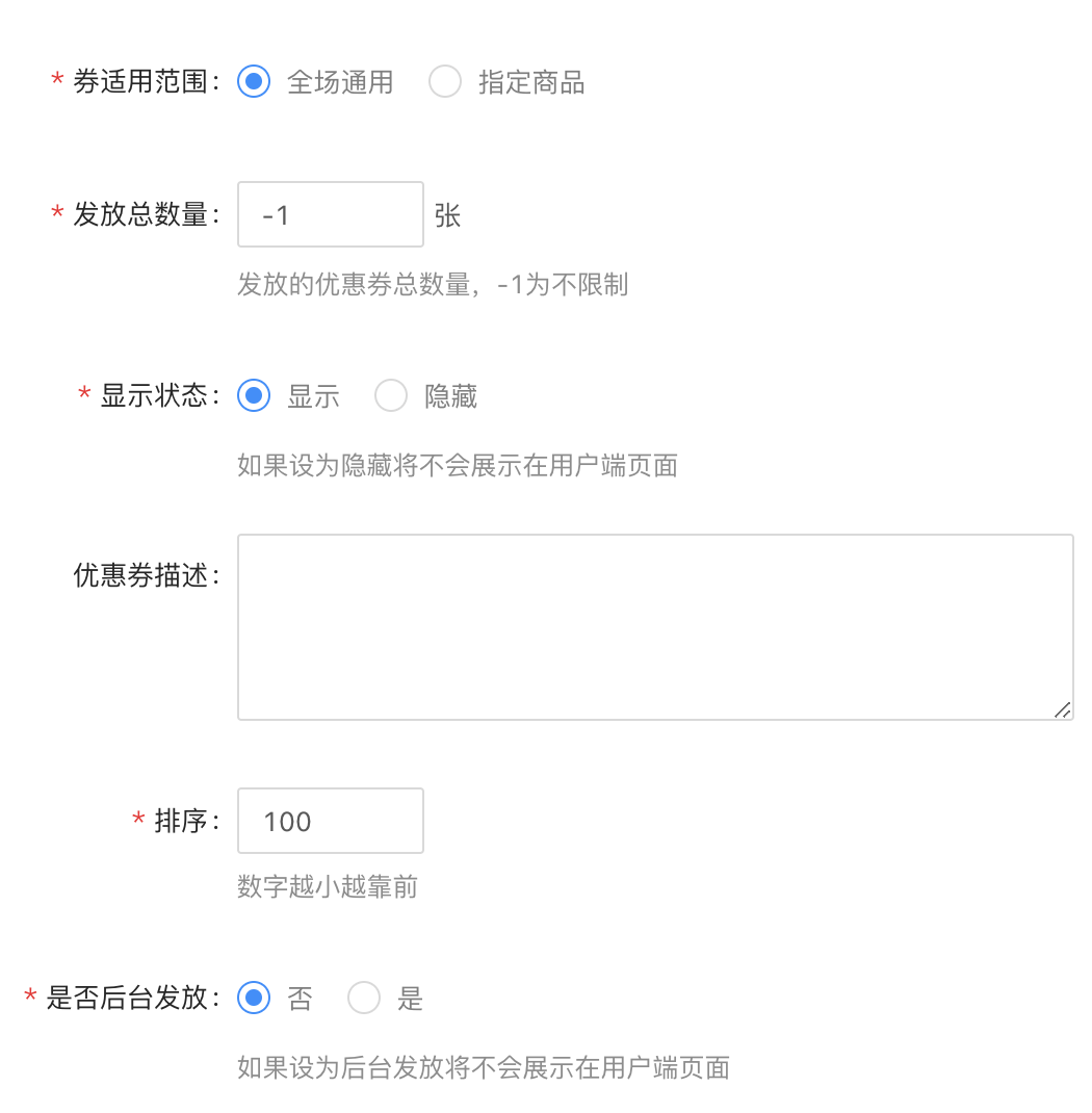 新增优惠券页面,选择后台发放,客户端不会显示,可以在后台发放