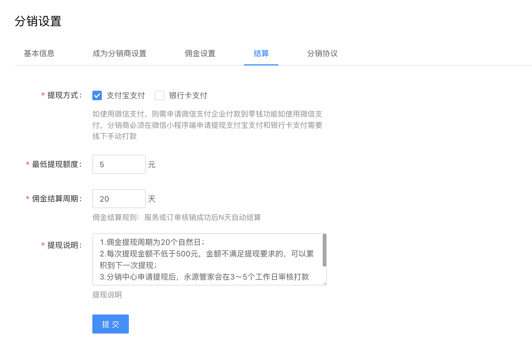 此页面用于管理分销设置,包含**基本信息**、**成为分销商设置**、**佣金设置**、**结算**、**分销协议**