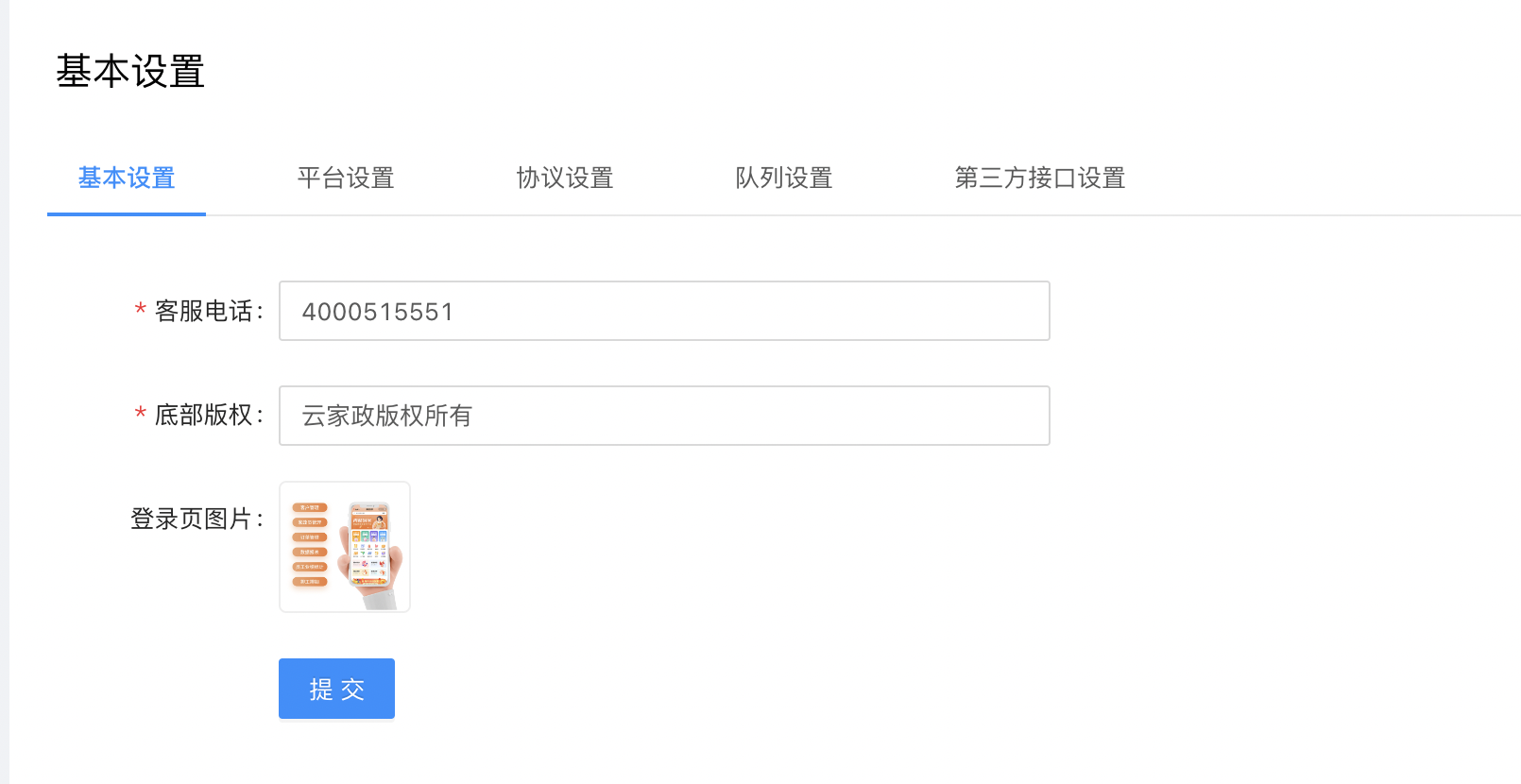 包含**基本设置**、**平台设置**、**协议设置**、**第三方接口设置**、**队列设置**设置