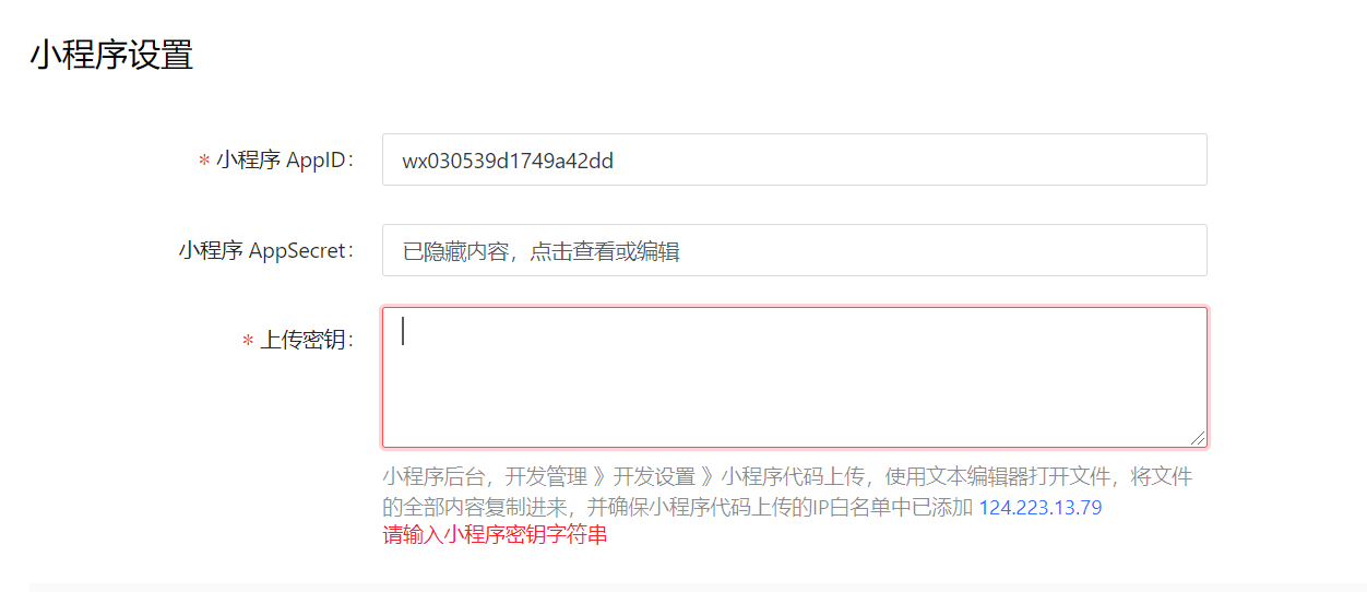 请确保小程序代码上传的IP白名单中已添加124.223.13.79