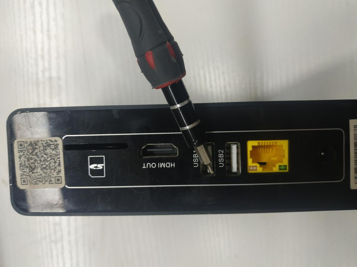 **短接好后接通玩客云电源。将玩客云和运行”USB\_Burning\_Tool”刷机软件的主机用USB电缆相联接。玩客云接靠近HDMI接口的USB端口,主机接可靠的USB端口。**