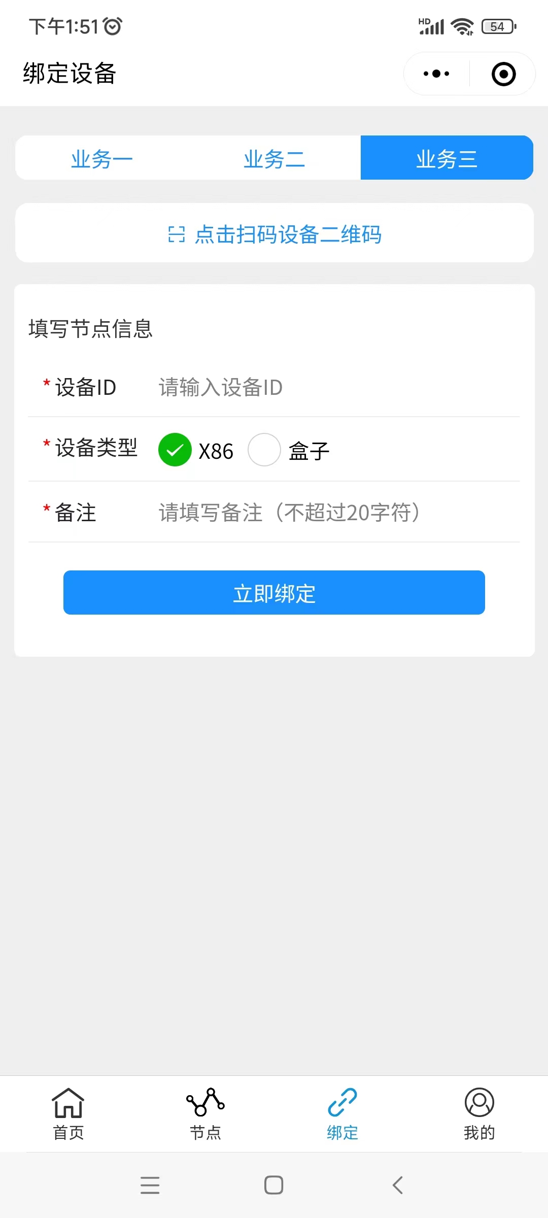 最后登录小程序 选择业务三扫码填写信息绑定节点