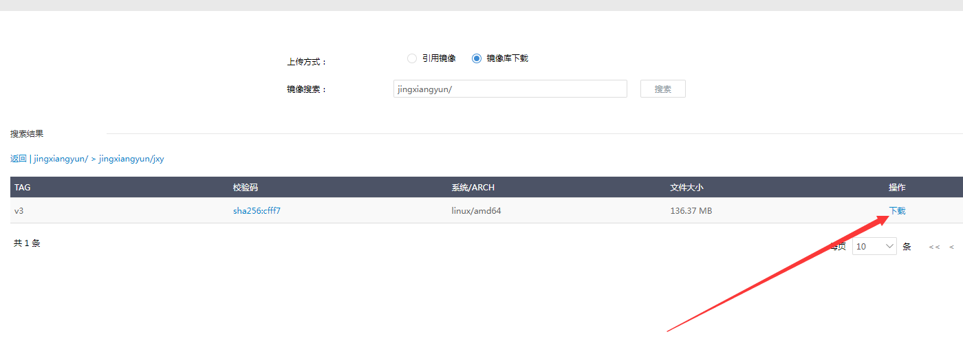 选择镜像库下载,并搜索jingxiangyun相关镜像,选择jingxiangyun/wjxy:v3进入下载。