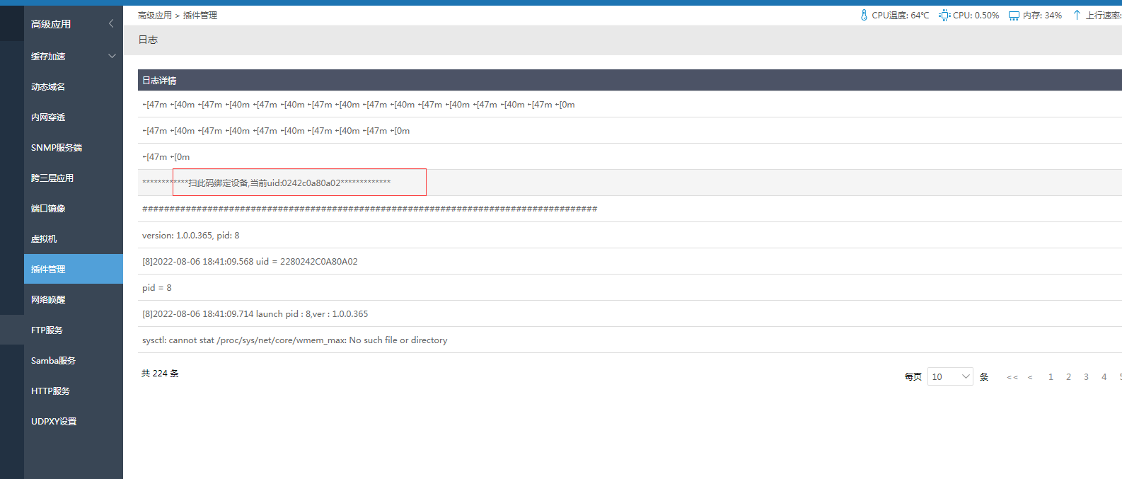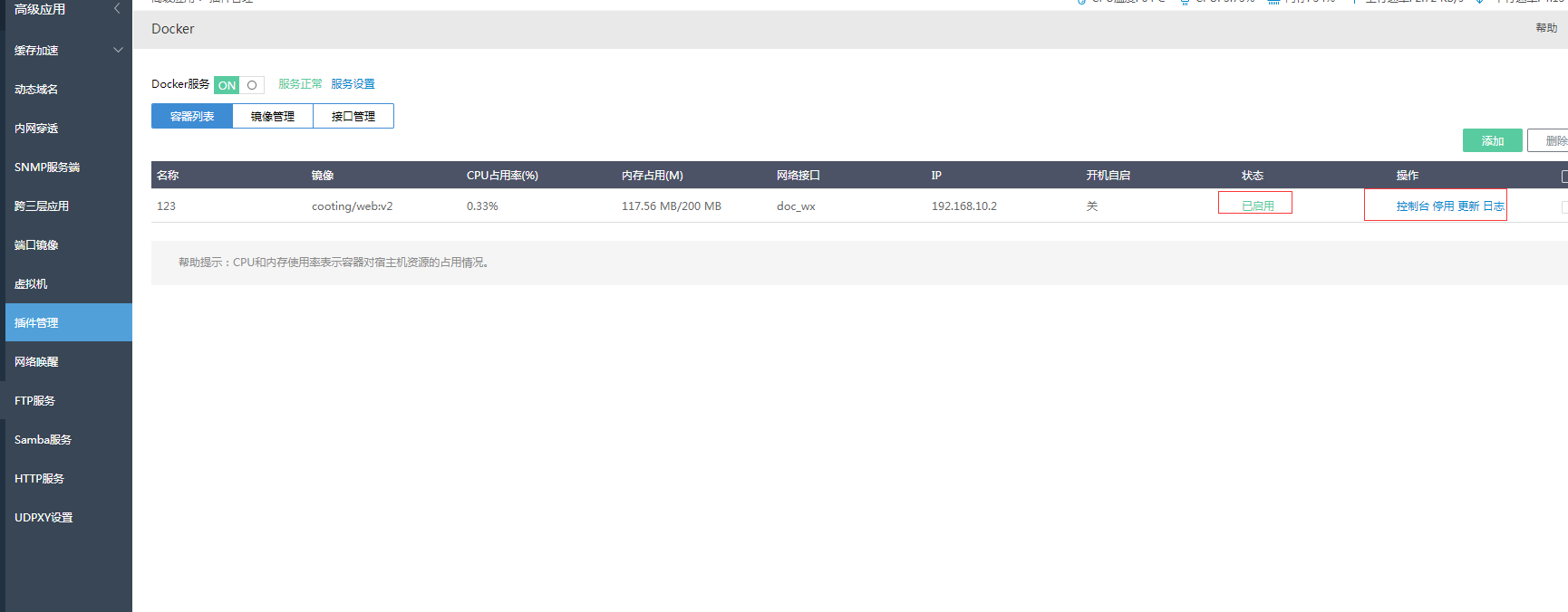 再回到爱快控制台就会发现docker插件已经安装完成,如果未成功可以稍等一会儿再看。