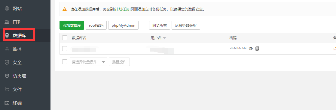 如果忘记数据库相关信息,可在**宝塔后台→数据库**中查看