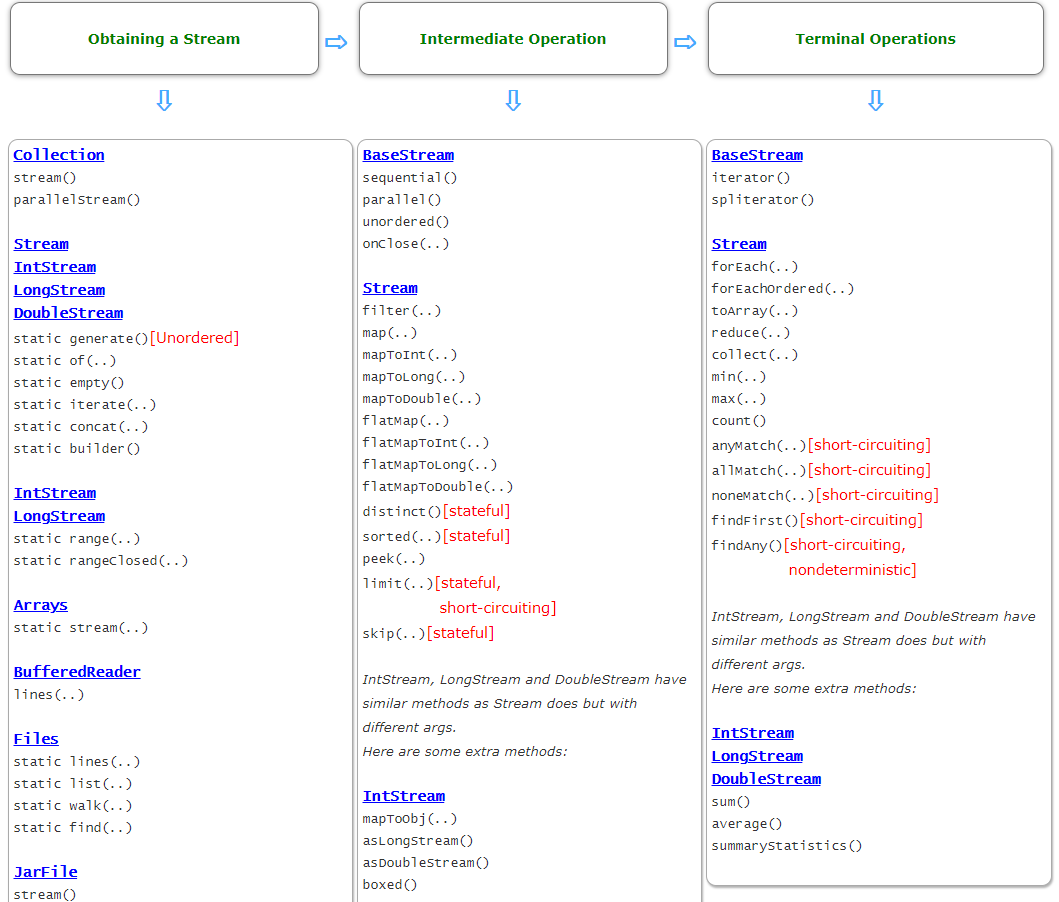 如图 蓝色区域是流的创建,包括数组、文件、集合等;淡黄色区域是流的中间操作,包括过滤、排序、映射、扁平化等;绿色区域是流的终端操作,包括分组、收集、统计、归约等。